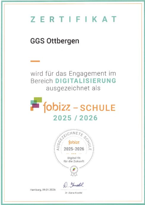 Wir wurden für unser besonderes Engagement im Bereich Digitalisierung als fobizz-Schule ausgezeichnet. Diese Ehrung würdigt unseren kontinuierlichen Einsatz für innovative Lernkonzepte, den souveränen Umgang mit digitalen Medien und die stetige Weiterbildung unseres Kollegiums.